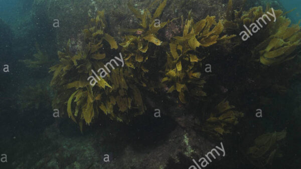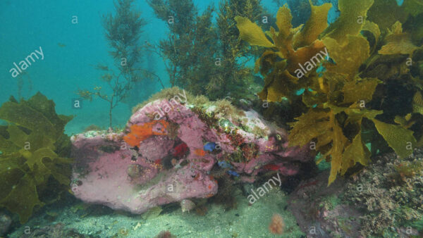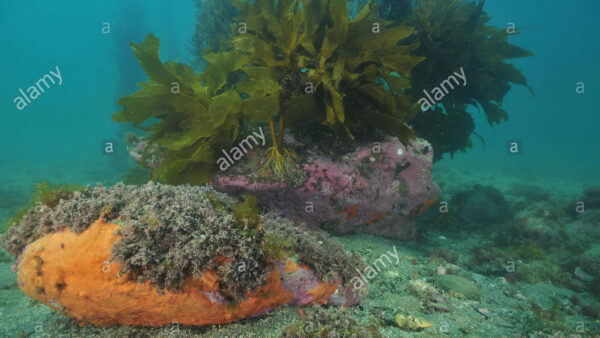 Boulders covered with kelp on top and encrusting sponges on bottom