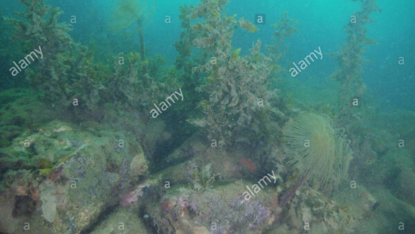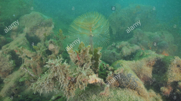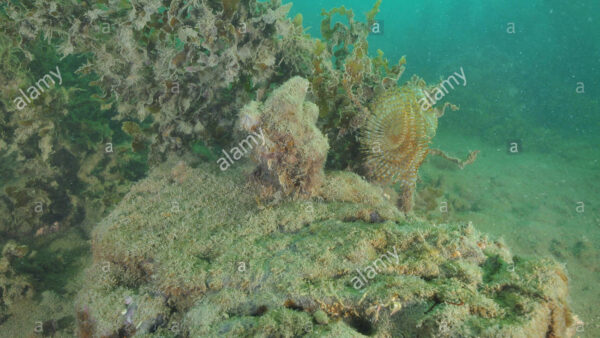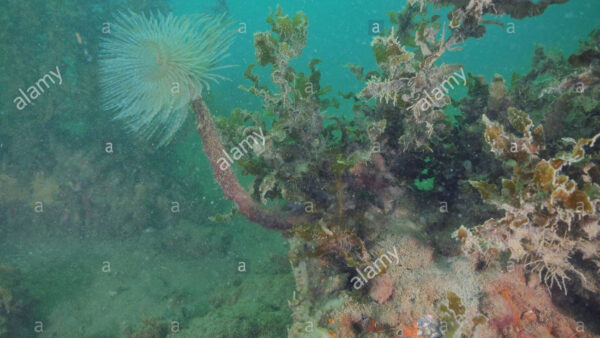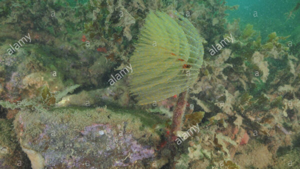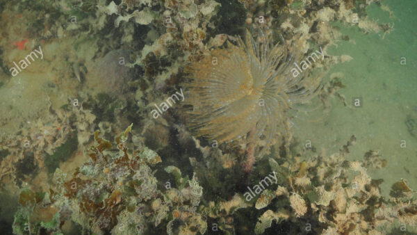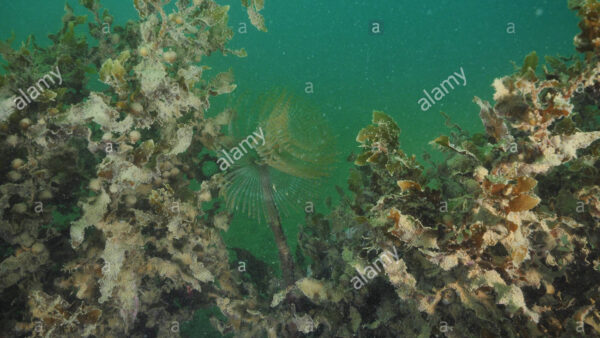 Mediterranean fanworm Sabella spallanzanii among brown seaweeds in murky water