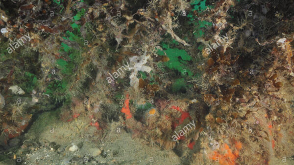 Rich encrusting life under brown seaweeds struggling with sediment.