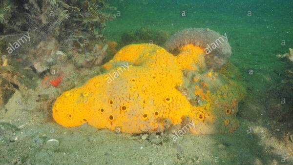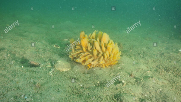 Yellow nipple sponge (Polymastia) on flat muddy bottom