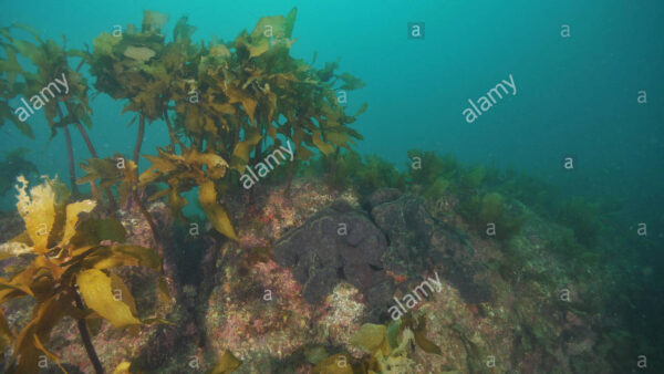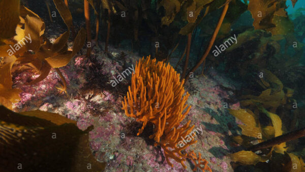 Colourful sponges among brown kelp Ecklonia radiata in southern Pacific ocean.