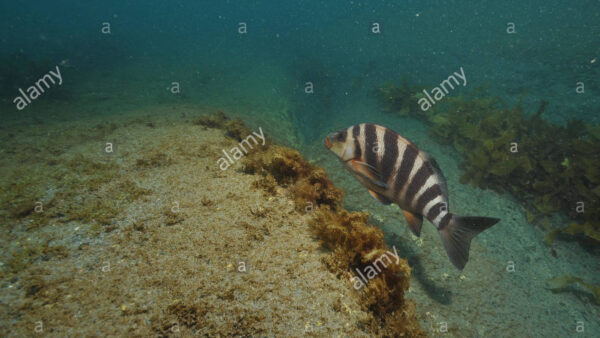 Red moki colorful shallow water rocky reef under kelp forest
