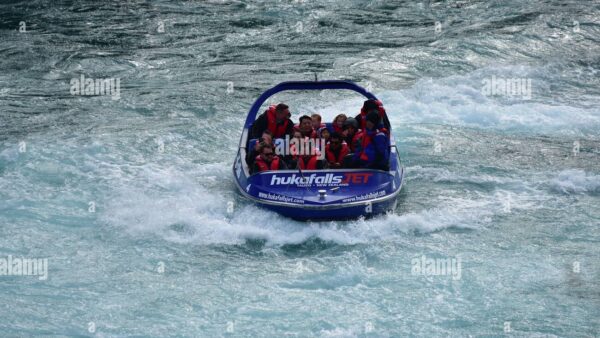 Front view of Huka Falls jet boat with tourists on board in fast moving water.
