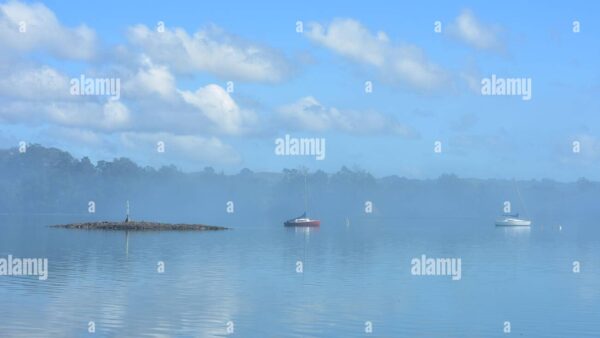 Disappearing fog in calm morning harbour revealing moored vessels.