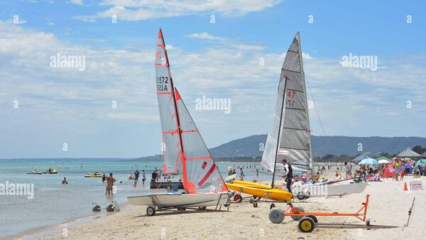 Small sail boats parked in beach trailers on shore with holidaymakers enjoying shallow water or hiding in shade of sun umbrellas in background.