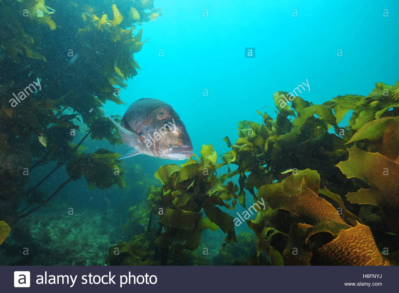 Adult australasian snapper Pagrus auratus swimming among rocks covered with brown kelp Ecklonia radiata.