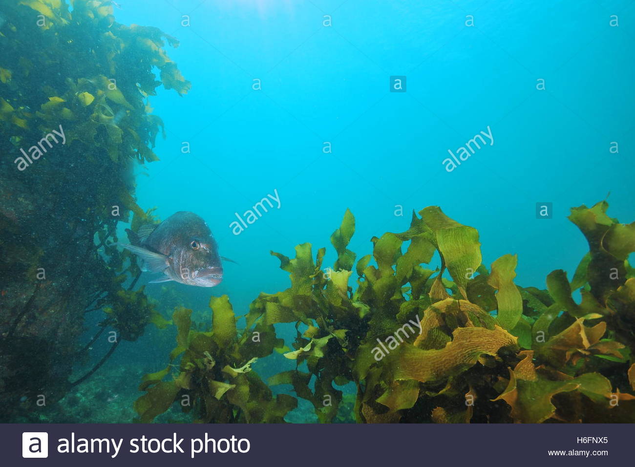 Adult australasian snapper Pagrus auratus swimming among rocks covered with brown kelp Ecklonia radiata.