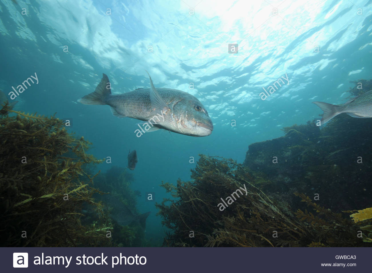 Big australasian snapper Pagrus auratus descending among rocks covered with seaweeds.