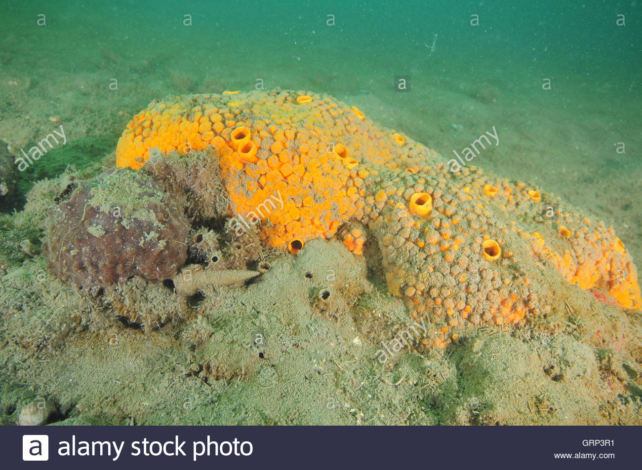Brown meatball (Tethya) and yellow boring (Cliona celata) sponges on muddy bottom