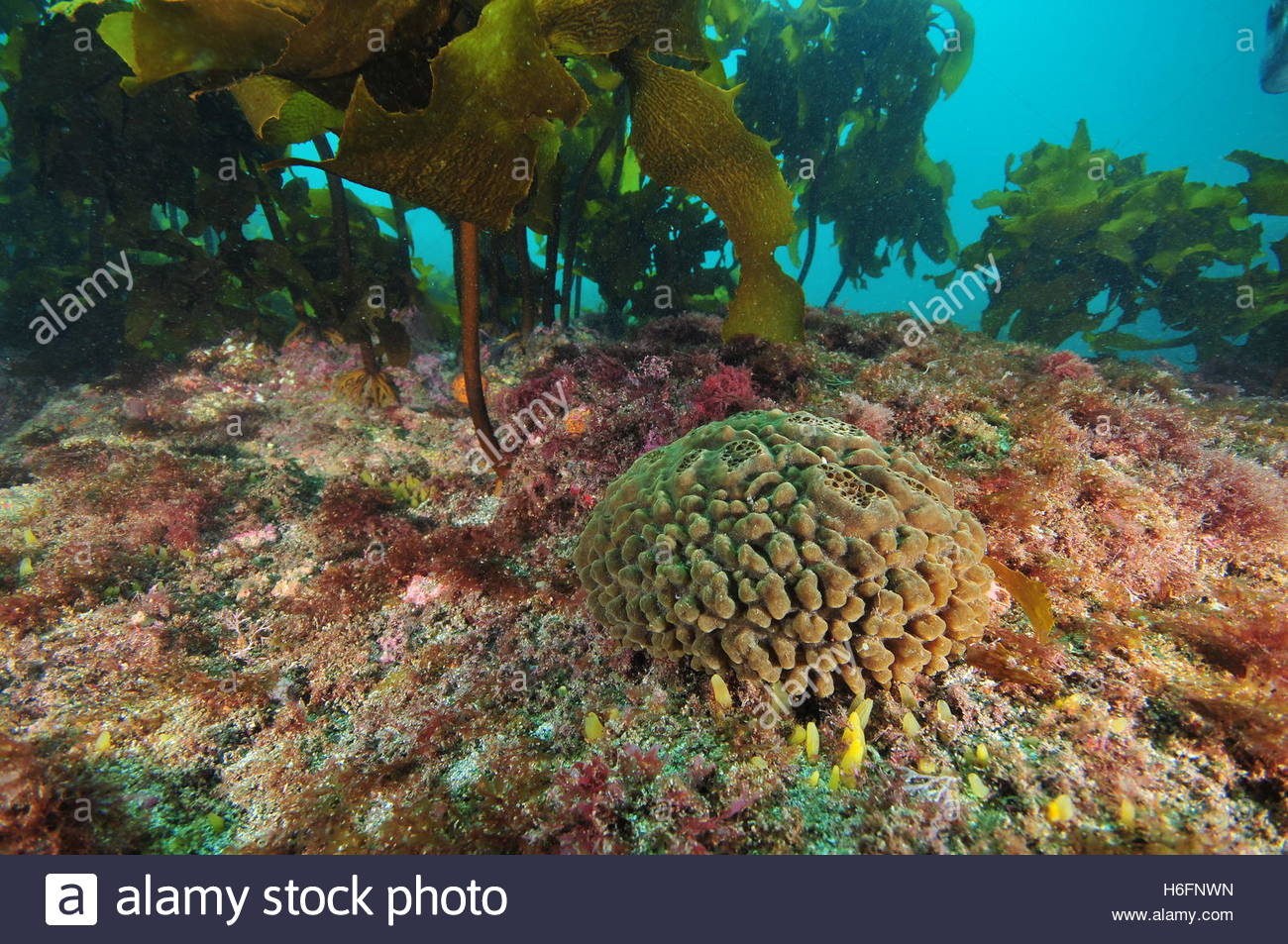 Brown sponge on flat rocky bottom under kelp