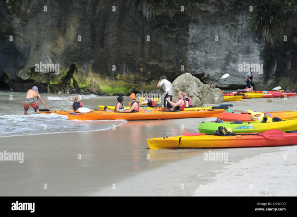 A group of kayakers on the beach of Cathedral Cove near Hahei, Coromandel Peninsula, New Zealand