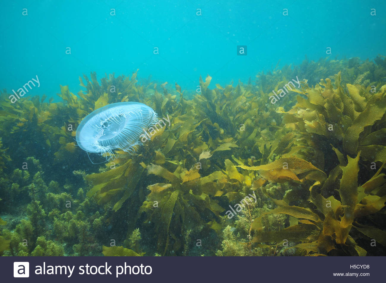 / Jellyfish hovering among kelp