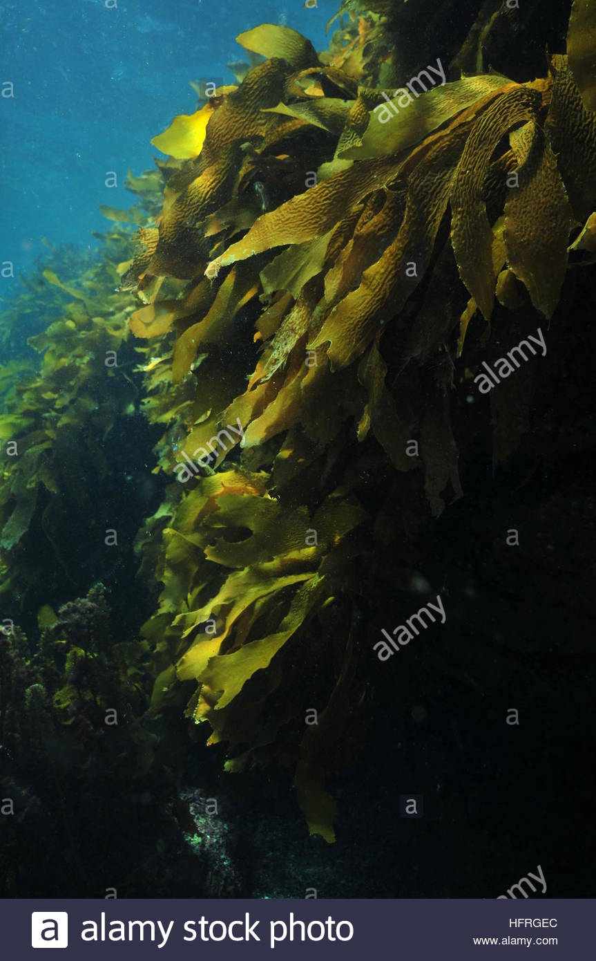 Kelp Ecklonia radiata on vertical rocky wall playing with sunlight.