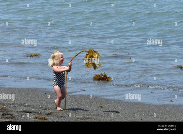 Little girl in swimsuit walking on beach with seaweed in hands.