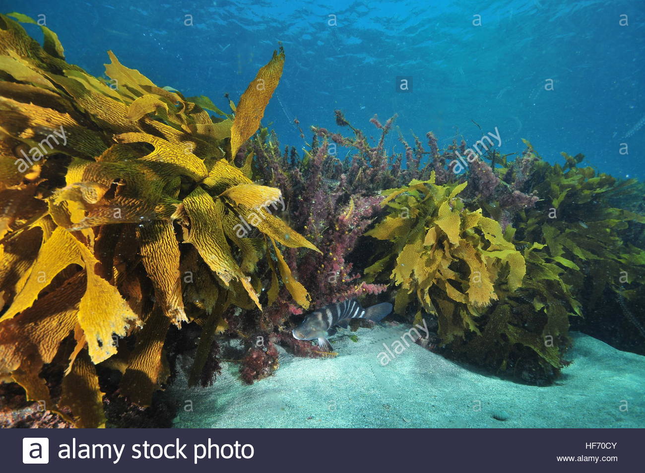 Kelp fronds forming low height but dense underwater forest where fish can hide.