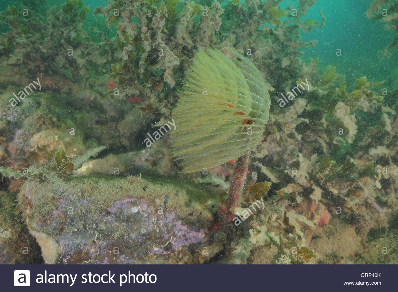 Mediterranean fanworm Sabella spallanzanii among brown seaweeds in murky water