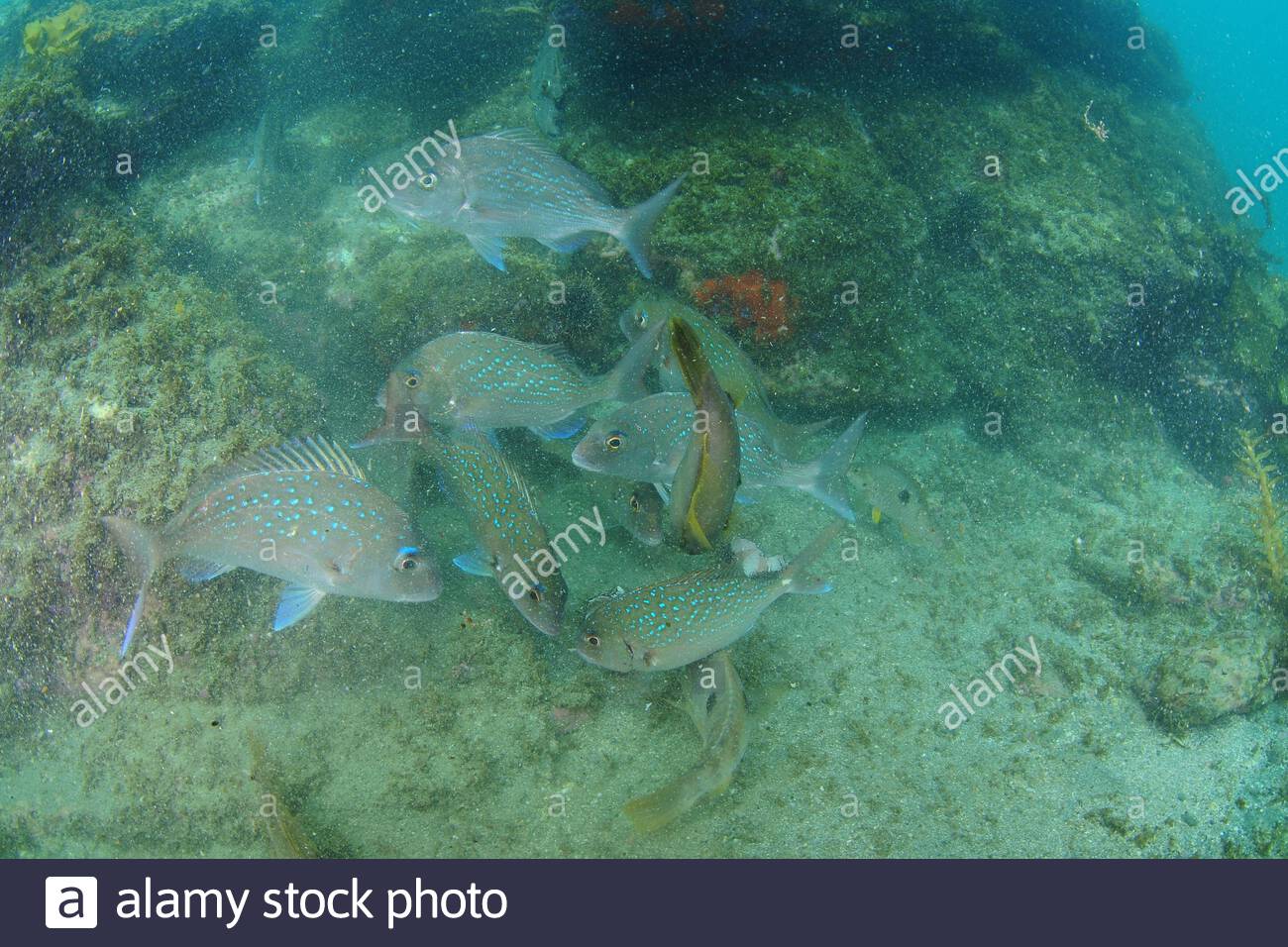 Melee of snapper and wrasse fish above rocky bottom in murky water with lot of particles.