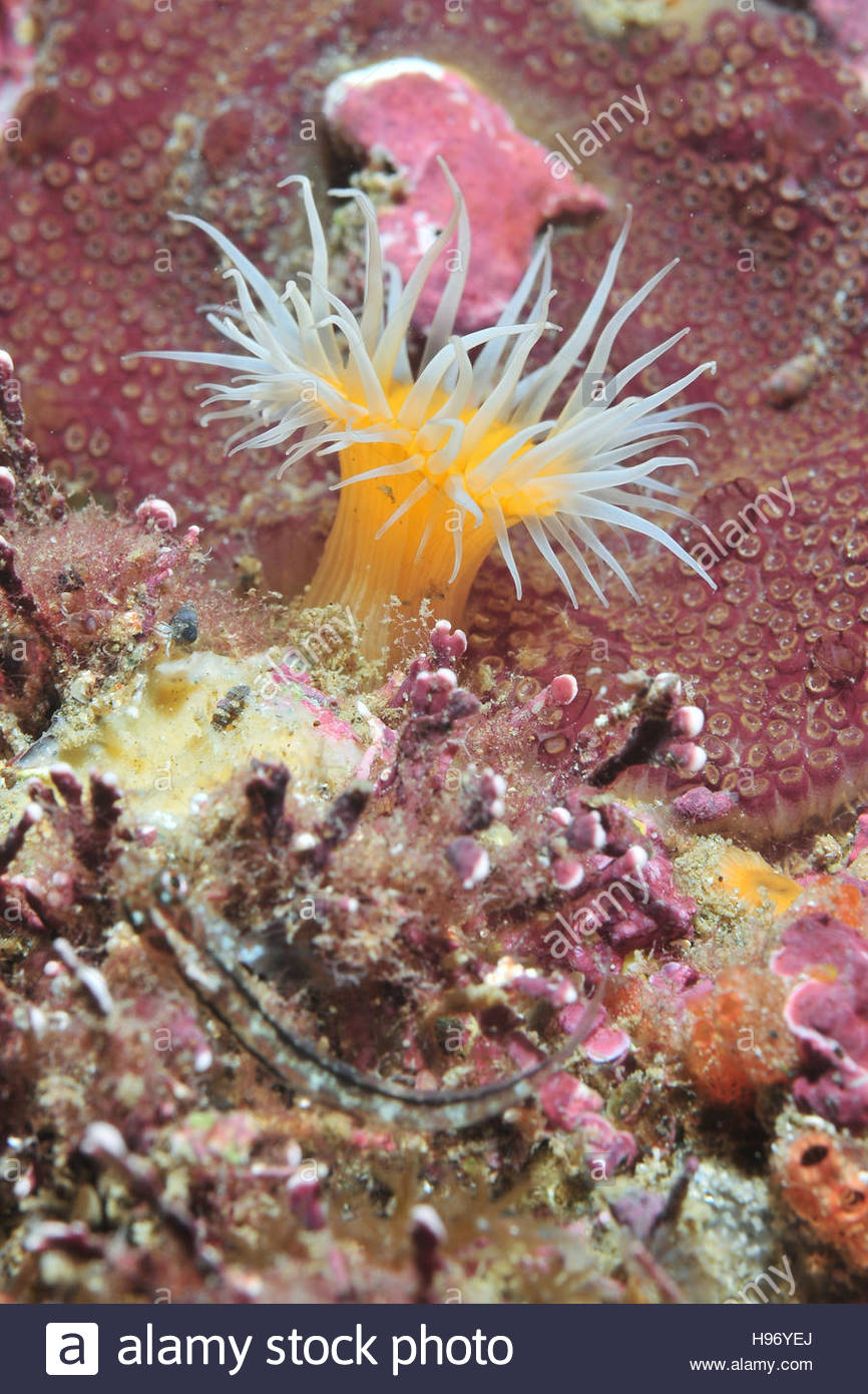 Open white-striped anemone Anthothoe albocincta among other encrusting life forms.
