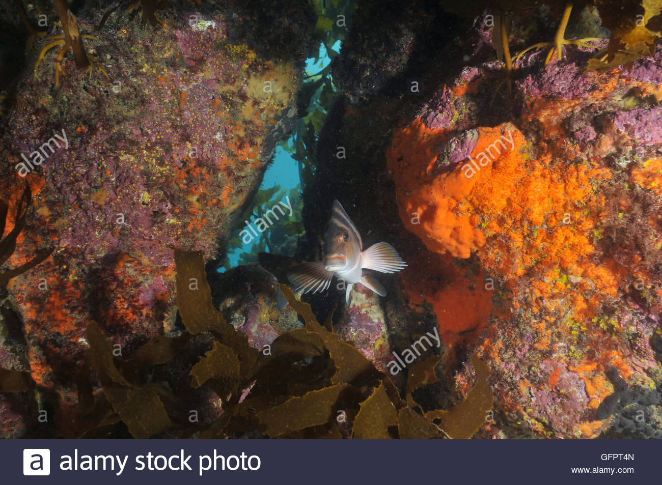 Red moki Cheilodactylus spectabilis in crack on shallow water rocky reef covered with colorful invertebrates under kelp forest in temperate southern Pacific ocean.