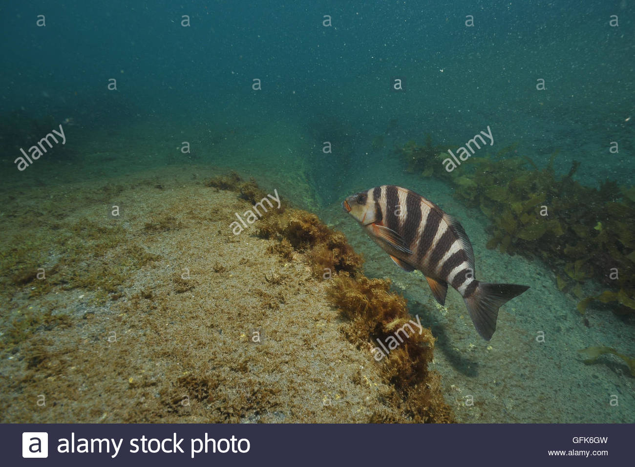 Red moki Cheilodactylus spectabilis above flat bottom partly covered with short brown algae.