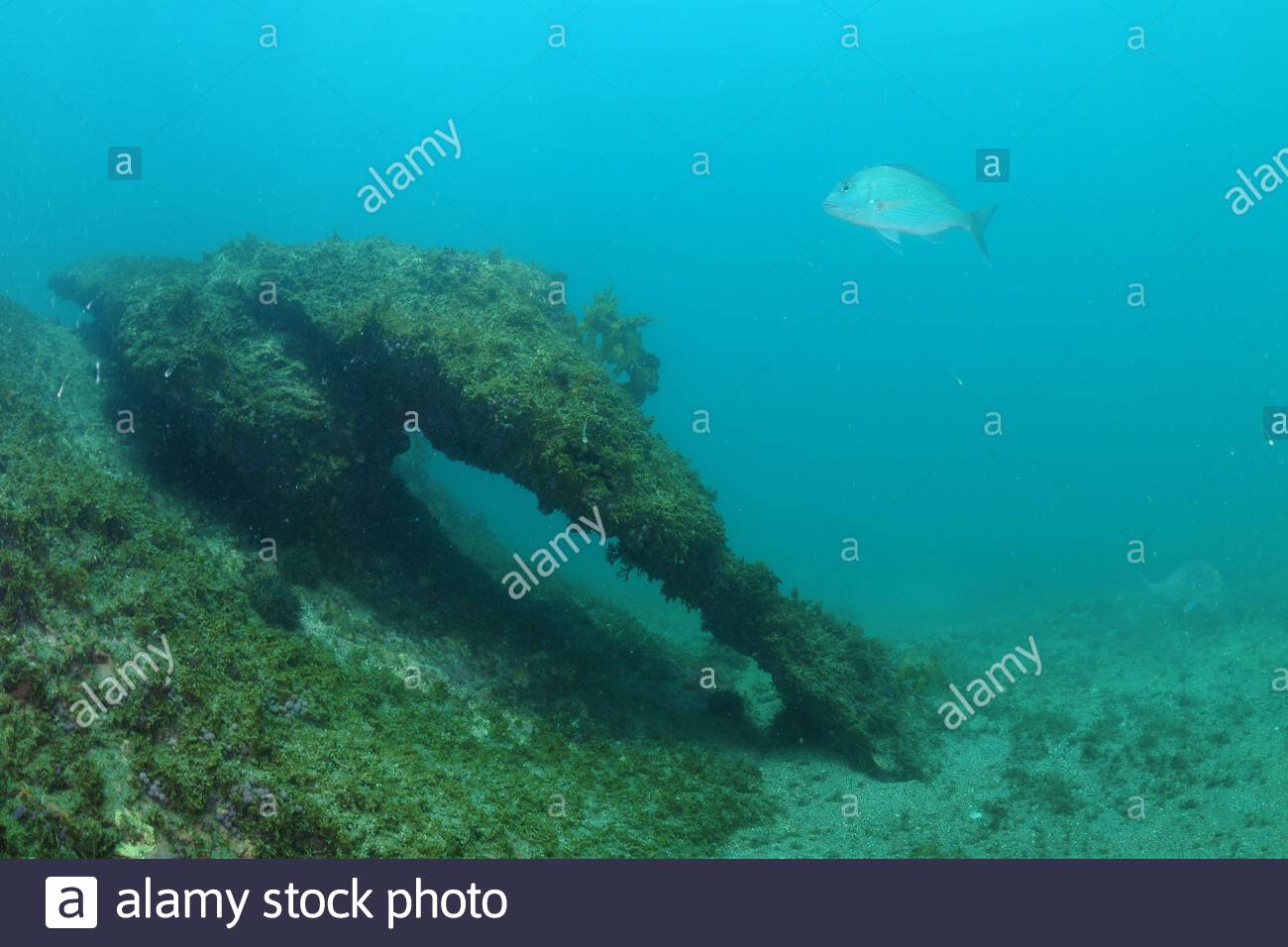 Rock of interesting shape appeared in distance with Australasian snapper hovering above it.