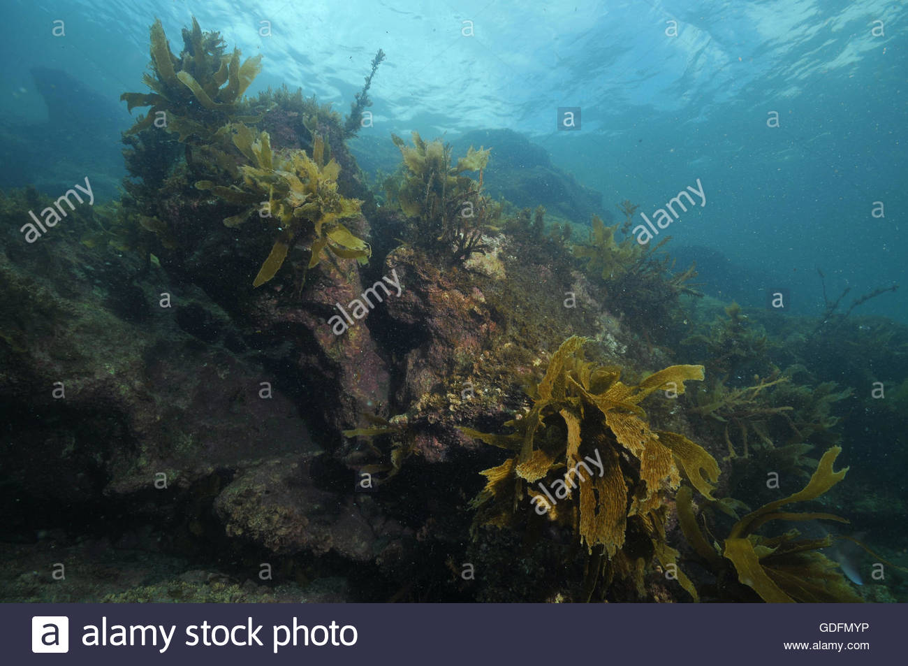 Rocky reef with some brown stalked kelp Ecklonia radiata growing on its walls.