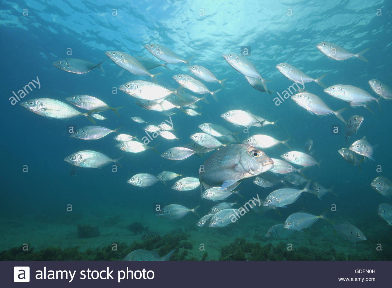 School of silver trevally Caranx georgianus and one australasian snapper Pagrus auratus swimming above flat bottom in shallow water.