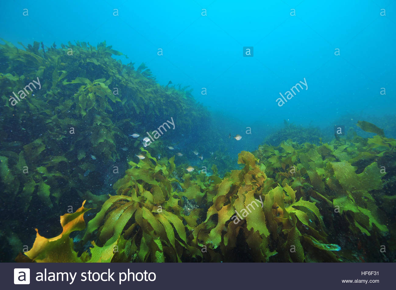 / Small school of sweeps hiding among fronds of kelp