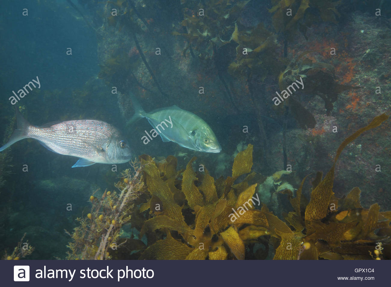 Australasian snapper and trevally among weeds of shallow water kelp forest.
