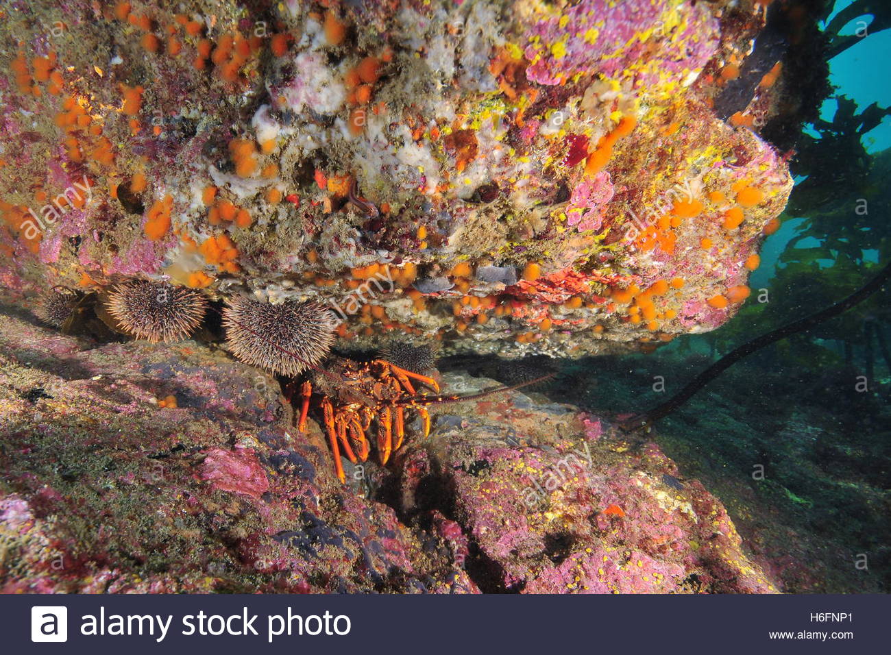Spiny lobster sharing crack with sea urchins under overhang covered with rich encrusting life.