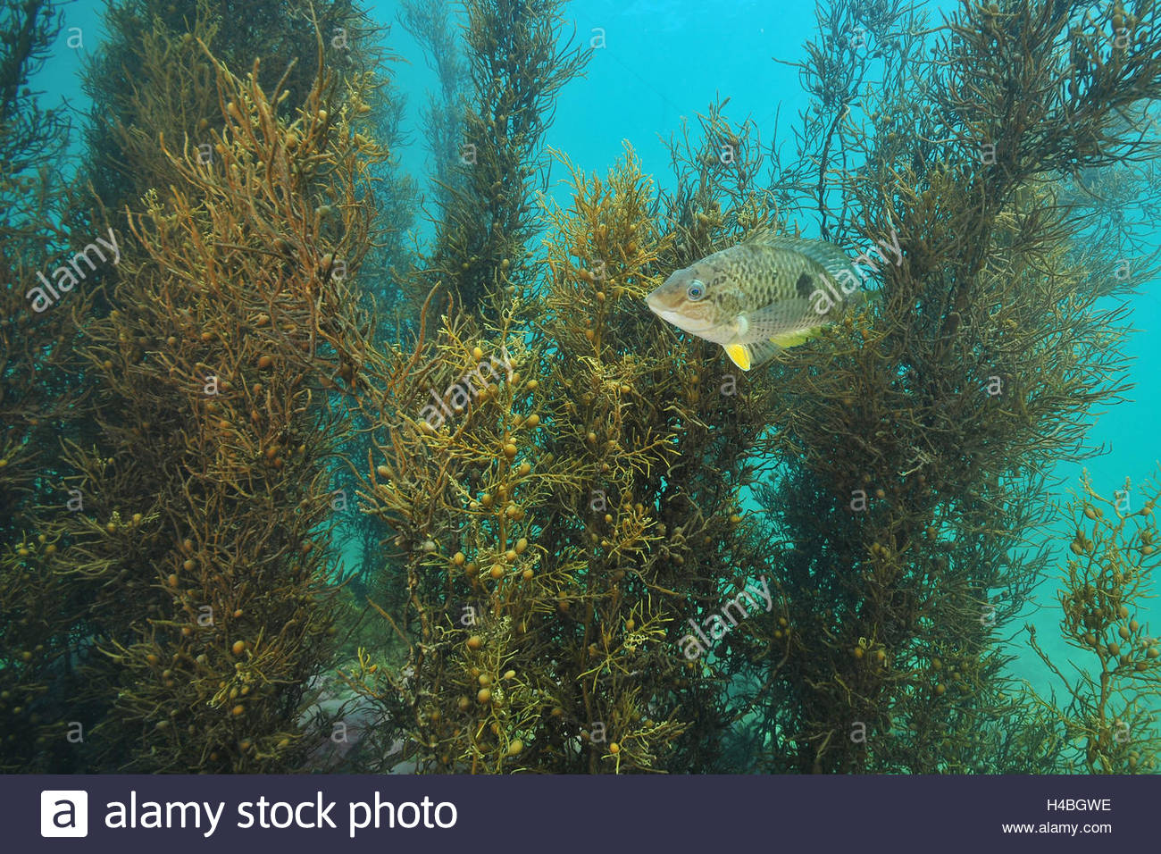 Spotty wrasse Pseudolabrus celidotus hiding in brown sea weeds.