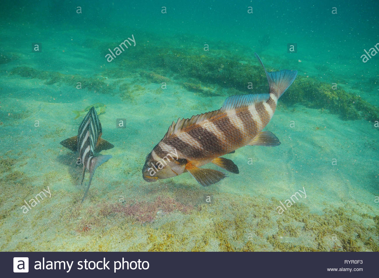 Two banded morwongs Cheilodactylus spectabilis feeding on hard algae from flat bottom of mixed sand and rocks.