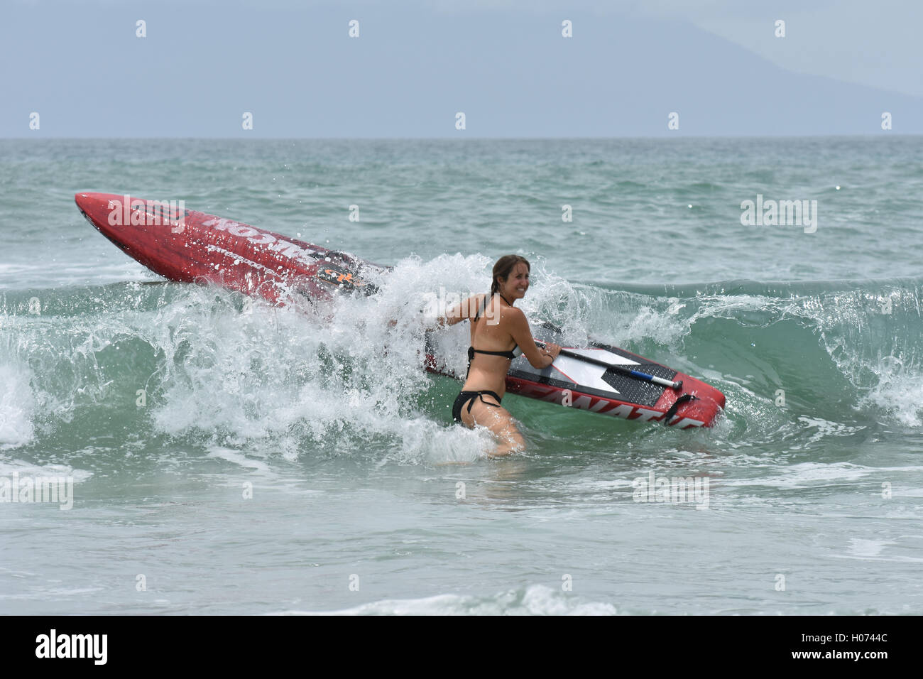Young woman wearing bikini trying paddleboarding in oceanic surf on cloudy day.